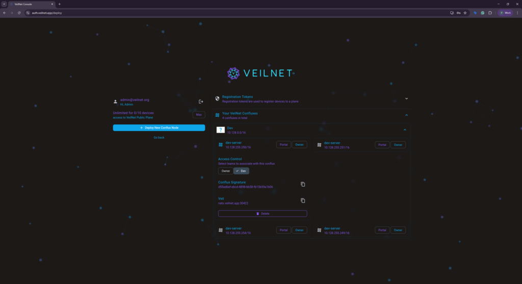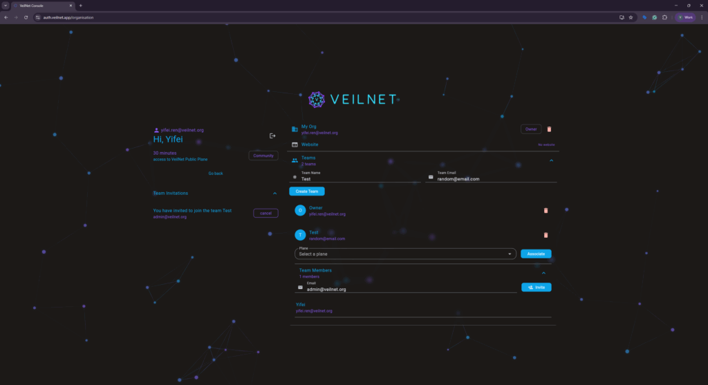 Both Community Plane and Private Plane can be associated with a team. If a Private Plane is associated, the team members will be able to deploy a VeilNet Conflux instance under the associated Private Plane, effectively achieving “sharing network” in other overlay network providers. However, we do not limit the number of teams or the number of members per team.