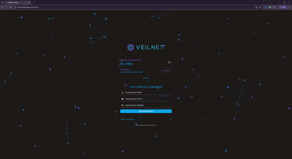 If you do not have an organisation, you will see the creation form shown above. You do not have to own any actual organisation. The organisation is used to organise your teams only, and you could input any name, email or website (we will expand features in the future).