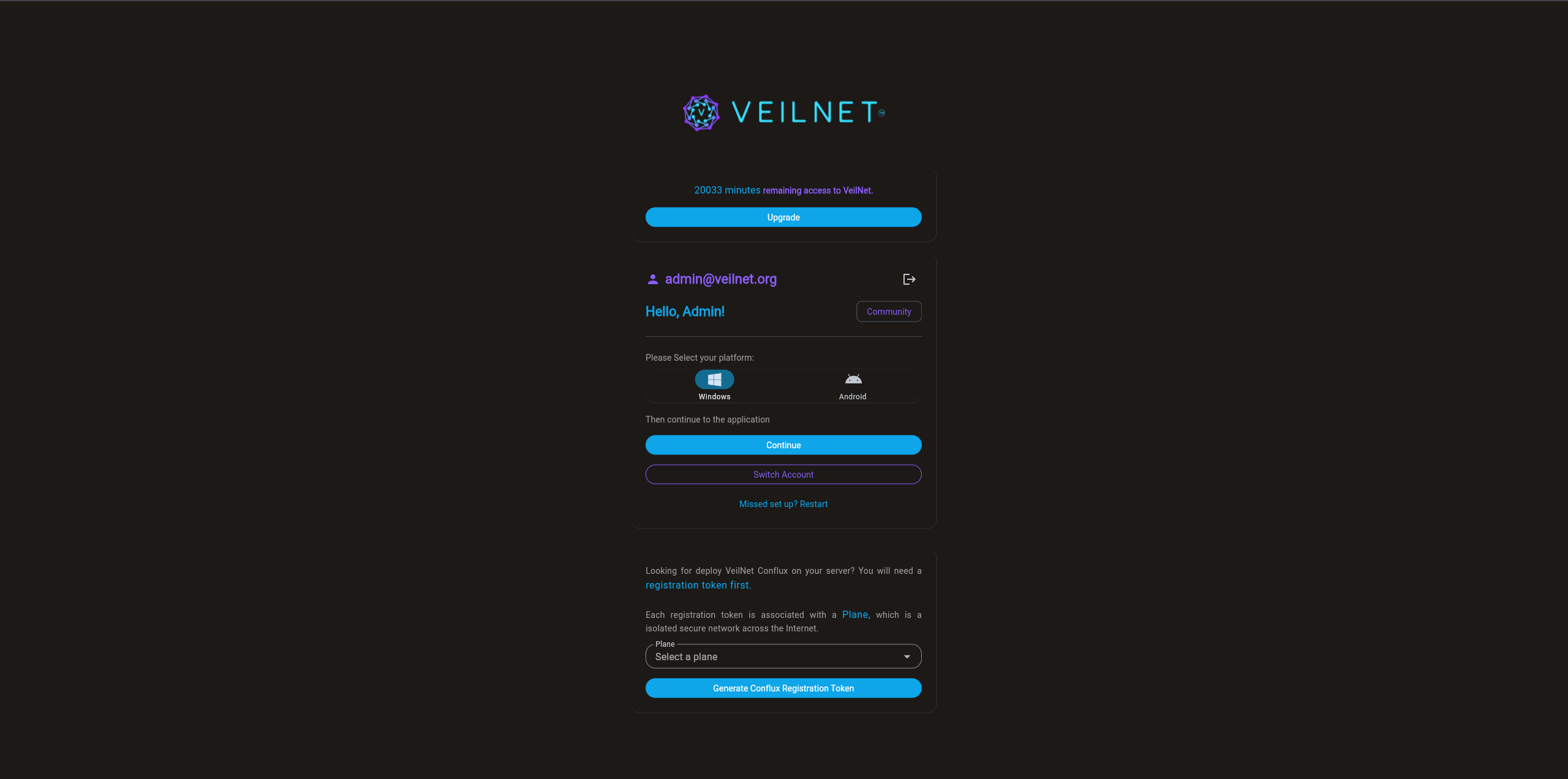 Simply select a Plane (aka, an isolated secure network in VeilNet), then click on the “Generate Conflux Registration Token” button. A unique token will be created for you, which is valid for 365 days.