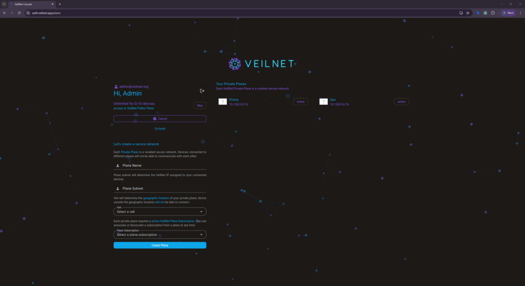 On this page, you will see your existing VeilNet Private Planes. To create a new one, simply connect the “Add Plane” button, then a form will show up.
