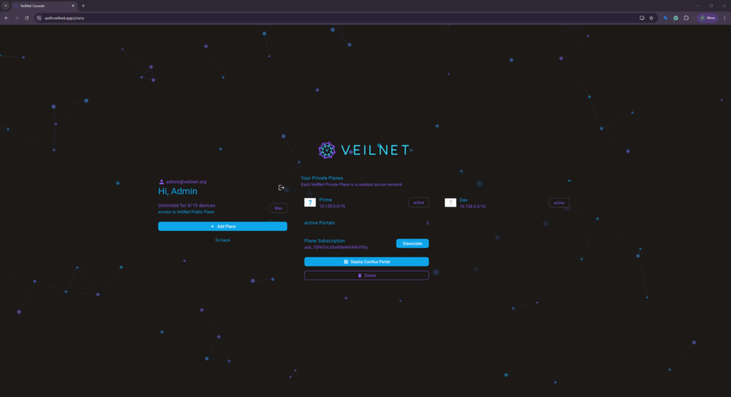 To delete a VeilNet Private Plane, simply click on the expansion title of the target plane and click on the “Delete” button. Be careful, deleting a VeilNet Private Plane will revoke all registration tokens linked to it, and disconnect all VeilNet Conflux instances under it.