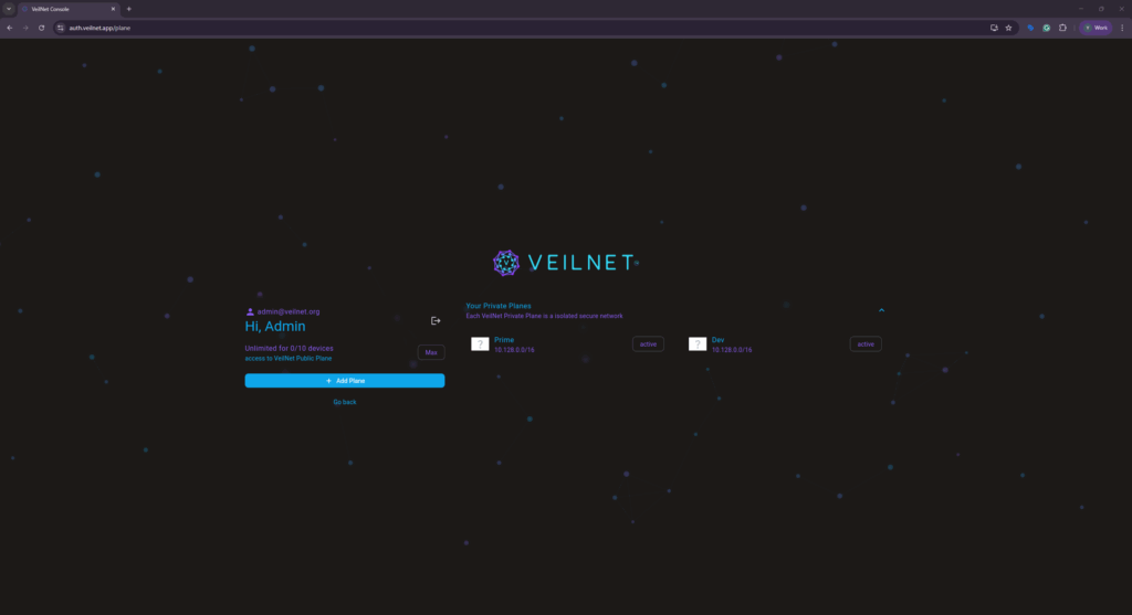 Each VeilNet Private Plane also requires an active Plane subscription. Currently, it is not open to the public. If you would like to have one, please contact us, and we will offer one for free during the Beta period.