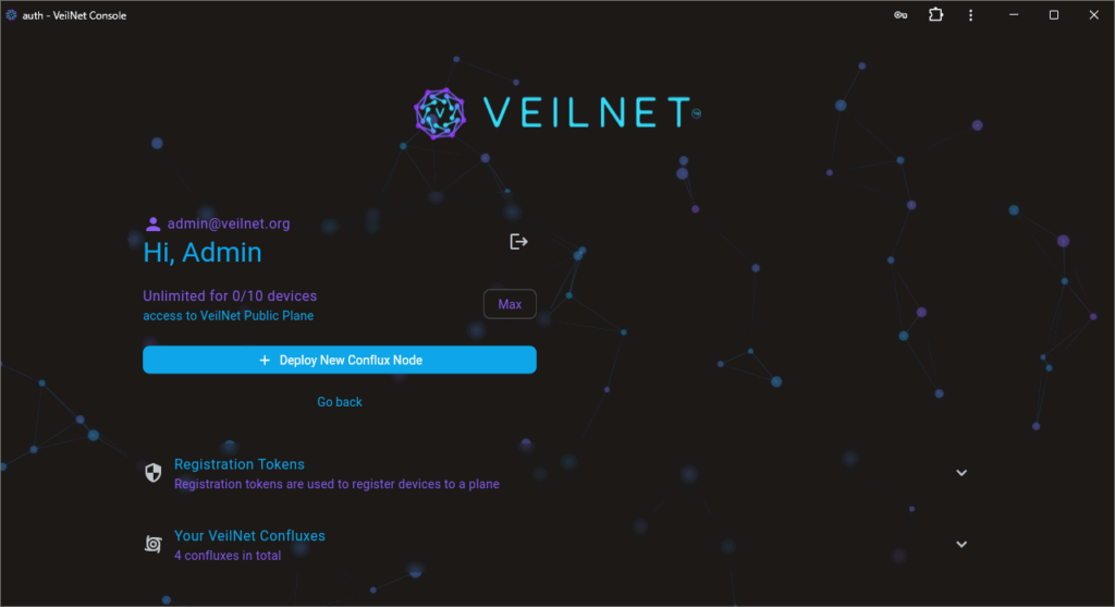To connect a new device, select the “Conflux” navigation tile on the right, top of the list. You will see the following page for managing the VeilNet Conflux instance in one place.
