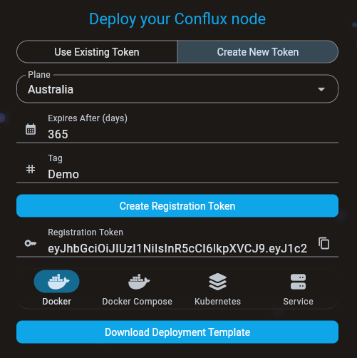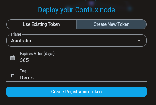 Click on “Deploy New Conflux Node” A form will appear. Choose “Create New Token”, select any plane that is available to you, set an expiration in days and a memorable tag. Then click on “Create Registration Token”, and your Conflux registration token is ready.